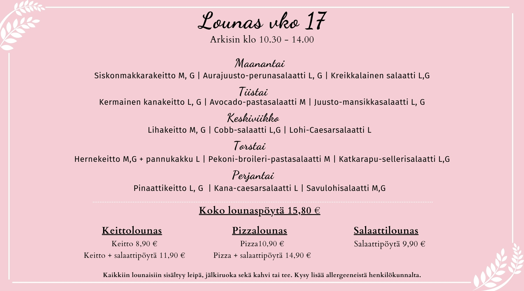 Tarjoamme maistuvan lounaan arkipäivisin – valittavanasi on keitto-, pizza- tai salaattivaihtoehto. Kaikkiin lounaisiin sisältyy tuore leipä, juoma sekä jälkiruoaksi kahvi ja pulla.