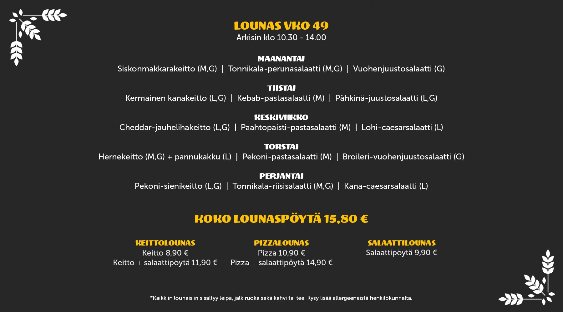 Kaikkiin lounasvaihtoehtoihin sisältyy leipä, juoma sekä jälkiruoaksi kahvi ja pulla.