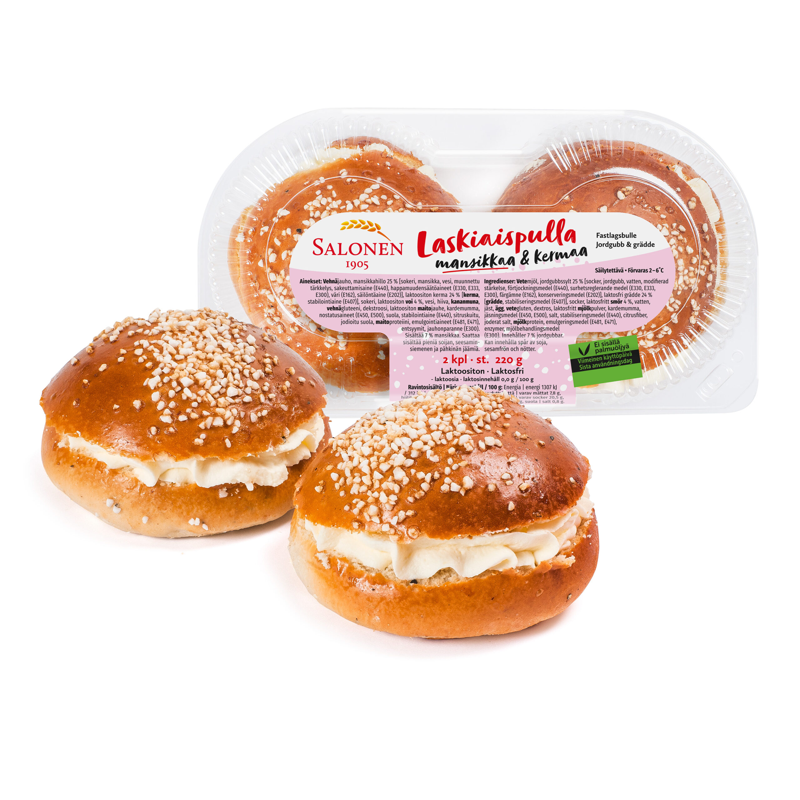 Ainesosat: Vehnäjauho, mansikkahillo 25 % [sokeri, mansikka, vesi, muunnettu tärkkelys, sakeuttamisaine (E440), happamuudensäätöaineet (E330, E333, E300), väri (E162), säilöntäaine (E202)], laktoositon kerma 24 % [kerma, stabilointiaine (E407)], sokeri, laktoositon voi 4 %, vesi, hiiva, kananmuna, vehnägluteeni, dekstroosi, laktoositon maitojauhe, kardemumma, nostatusaineet (E450, E500), suola, stabilointiaine (E440), sitruskuitu, jodioitu suola, maitoproteiini, emulgointiaineet (E481, E471), entsyymit, jauhonparanne (E300). Sisältää 7 % mansikkaa. Saattaa sisältää pieniä soijan, seesaminsiemenen ja pähkinän jäämiä.